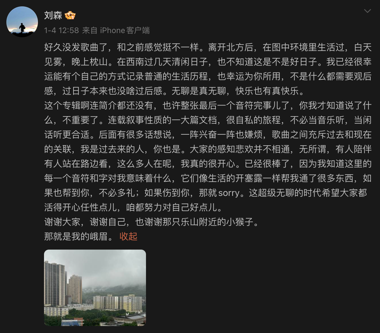 空气中似乎有一种魔力,可以把人的所有困意席卷一空,令人感到神奇。音响里放着刘森,窗外的车来车往,我突然意识到,我想重庆了。巧的是,森哥这新的两首歌也是发在川渝地区,难怪情绪那么充沛。